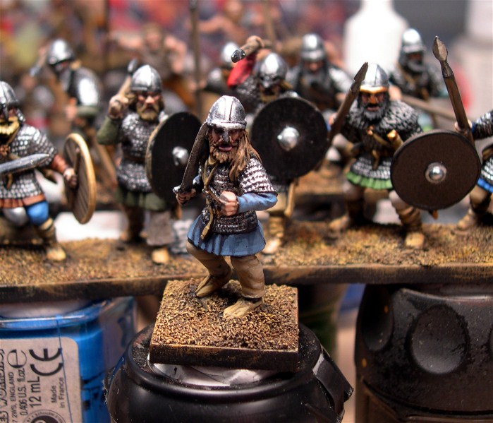 Above and below are mostly of the multi-based Vikings. They are pretty shiny right now. I'm setting the goal pretty low today, I just want to get the washes all on to define things and maybe paint the bases edges.